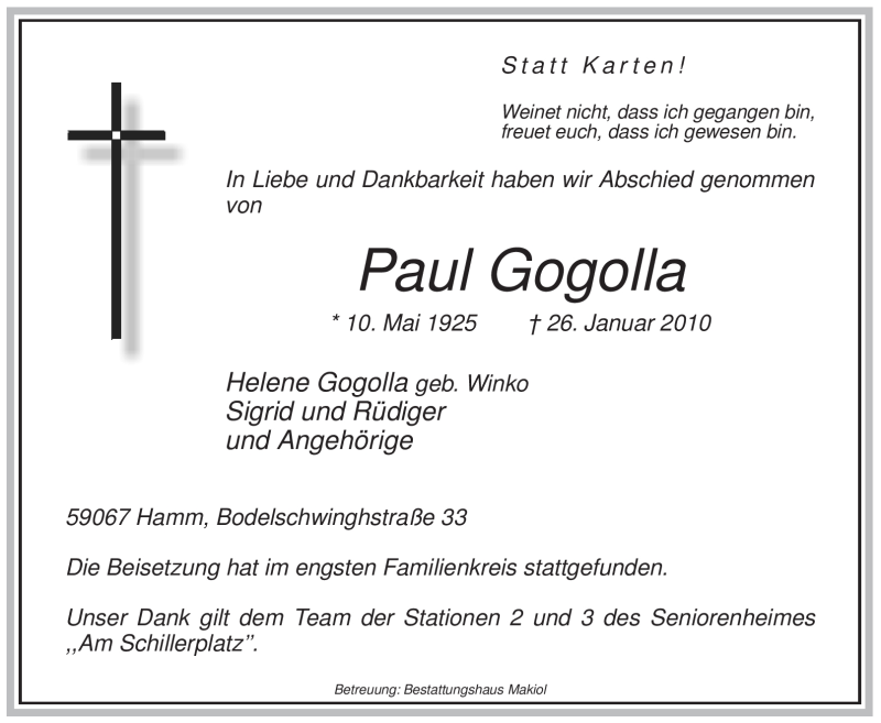 Hier finden Sie alle Traueranzeigen aus der Zeitung, die bisher für Paul Gogolla erschienen sind. Weitere Traueranzeigen, die in der Zeitung erscheinen, werden hier ebenfalls aufgelistet