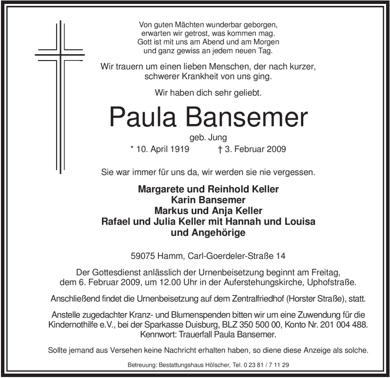 Hier finden Sie alle Traueranzeigen aus der Zeitung, die bisher für Paula Bansemer erschienen sind. Weitere Traueranzeigen, die in der Zeitung erscheinen, werden hier ebenfalls aufgelistet