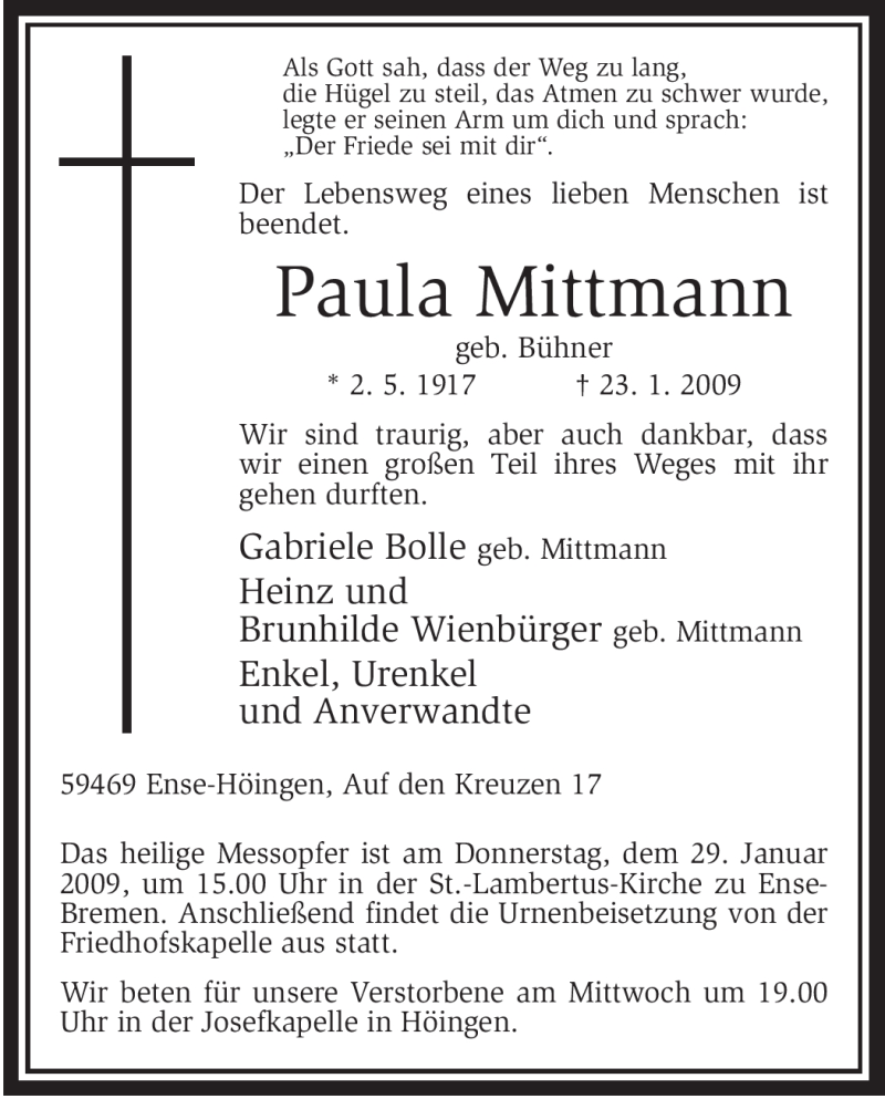 Hier finden Sie alle Traueranzeigen aus der Zeitung, die bisher für Paula Mittmann erschienen sind. Weitere Traueranzeigen, die in der Zeitung erscheinen, werden hier ebenfalls aufgelistet