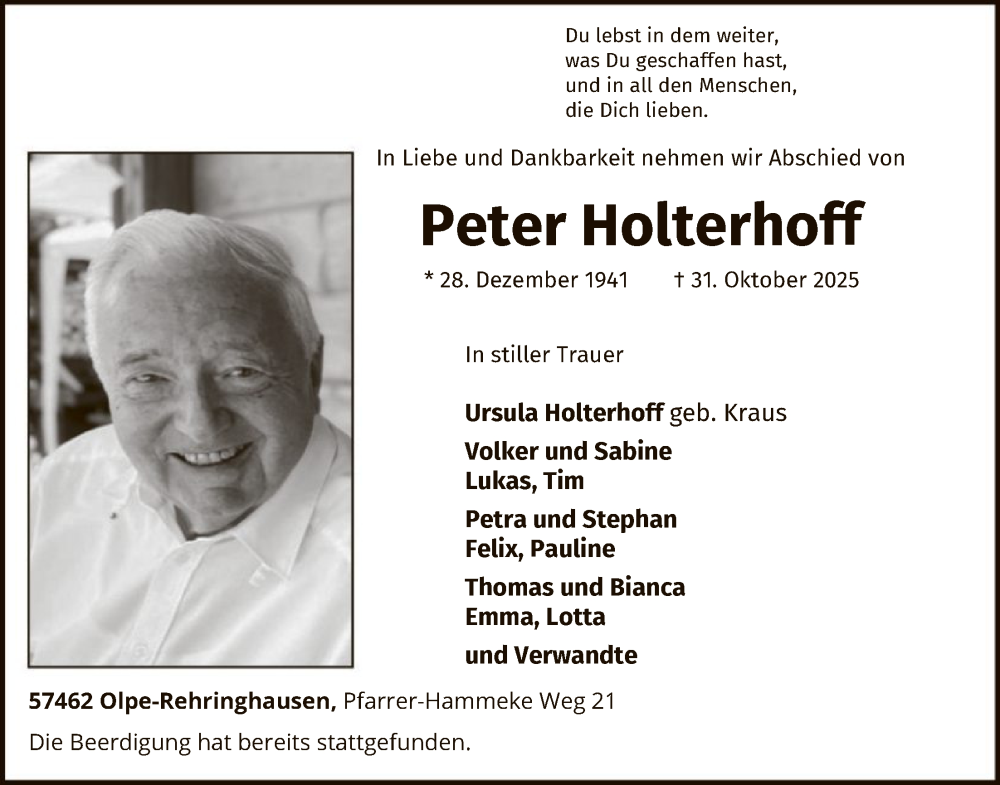 Hier finden Sie alle Traueranzeigen aus der Zeitung, die bisher für Peter Holterhoff erschienen sind. Weitere Traueranzeigen, die in der Zeitung erscheinen, werden hier ebenfalls aufgelistet