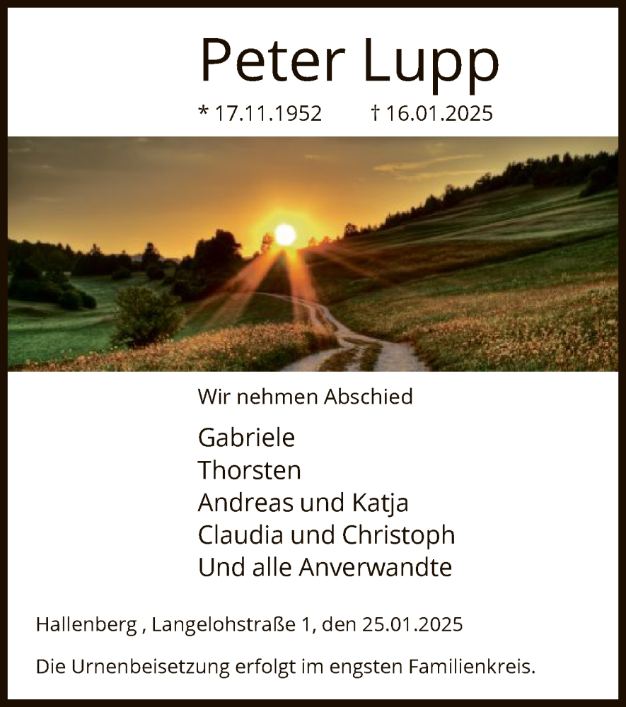Hier finden Sie alle Traueranzeigen aus der Zeitung, die bisher für Peter Lupp erschienen sind. Weitere Traueranzeigen, die in der Zeitung erscheinen, werden hier ebenfalls aufgelistet