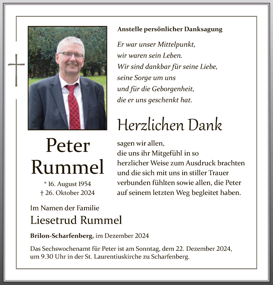 Hier finden Sie alle Traueranzeigen aus der Zeitung, die bisher für Peter Rummel erschienen sind. Weitere Traueranzeigen, die in der Zeitung erscheinen, werden hier ebenfalls aufgelistet
