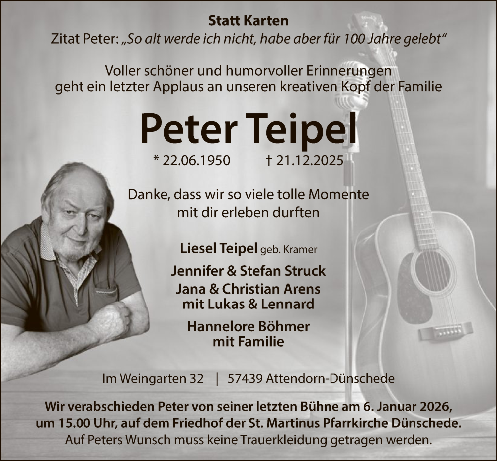 Hier finden Sie alle Traueranzeigen aus der Zeitung, die bisher für Peter Teipel erschienen sind. Weitere Traueranzeigen, die in der Zeitung erscheinen, werden hier ebenfalls aufgelistet