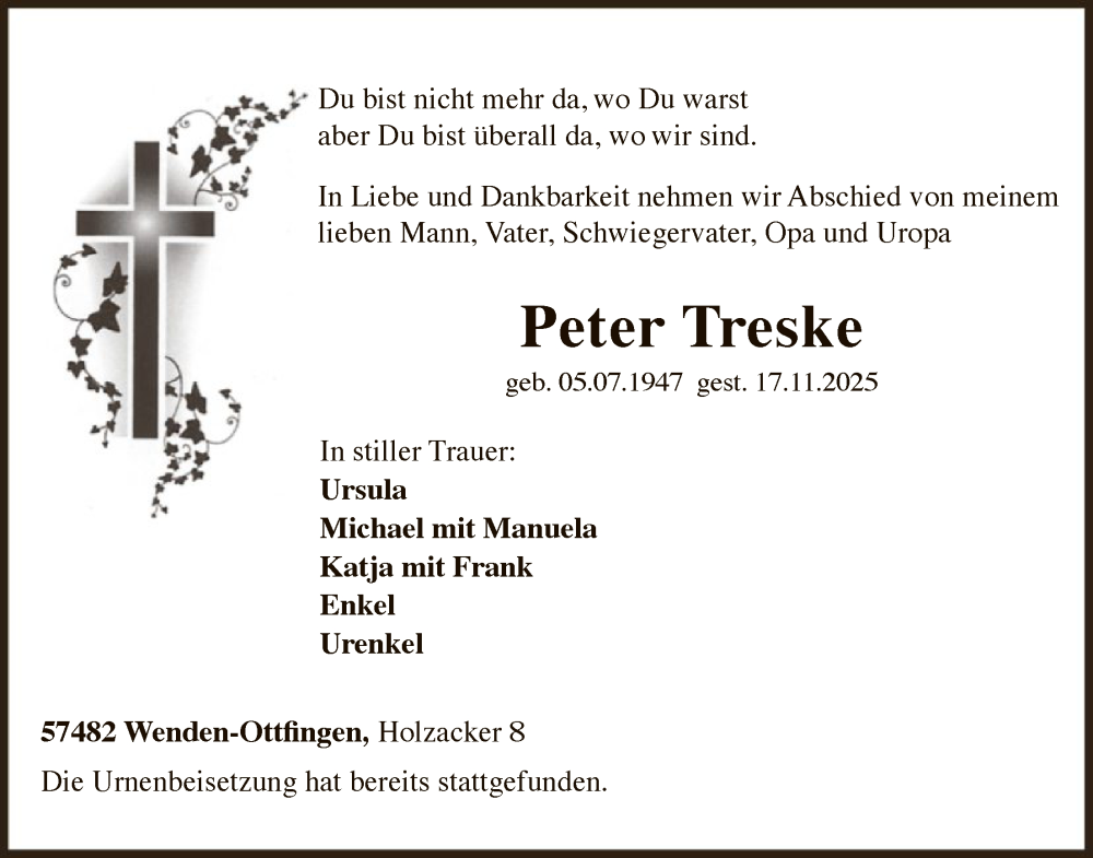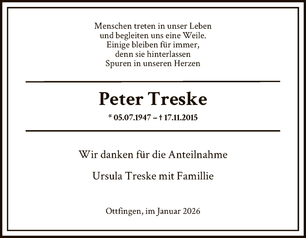 Hier finden Sie alle Traueranzeigen aus der Zeitung, die bisher für Peter Treske erschienen sind. Weitere Traueranzeigen, die in der Zeitung erscheinen, werden hier ebenfalls aufgelistet