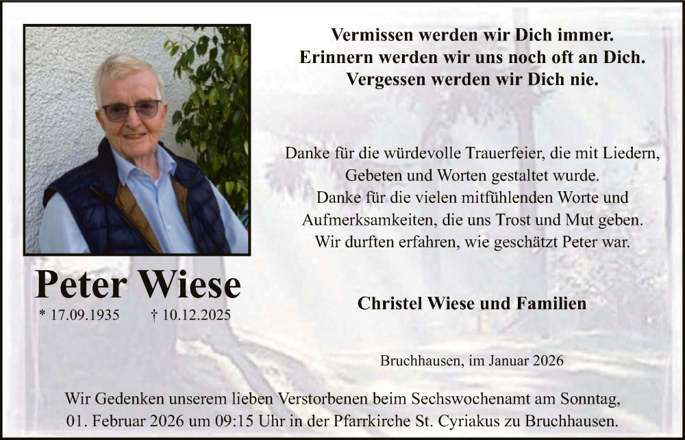 Hier finden Sie alle Traueranzeigen aus der Zeitung, die bisher für Peter Wiese erschienen sind. Weitere Traueranzeigen, die in der Zeitung erscheinen, werden hier ebenfalls aufgelistet