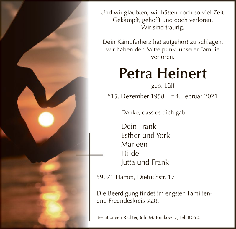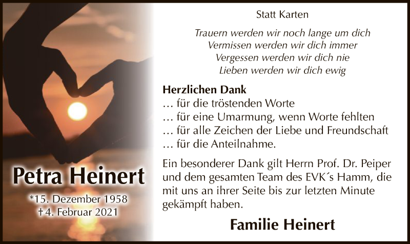 Hier finden Sie alle Traueranzeigen aus der Zeitung, die bisher für Petra Heinert erschienen sind. Weitere Traueranzeigen, die in der Zeitung erscheinen, werden hier ebenfalls aufgelistet