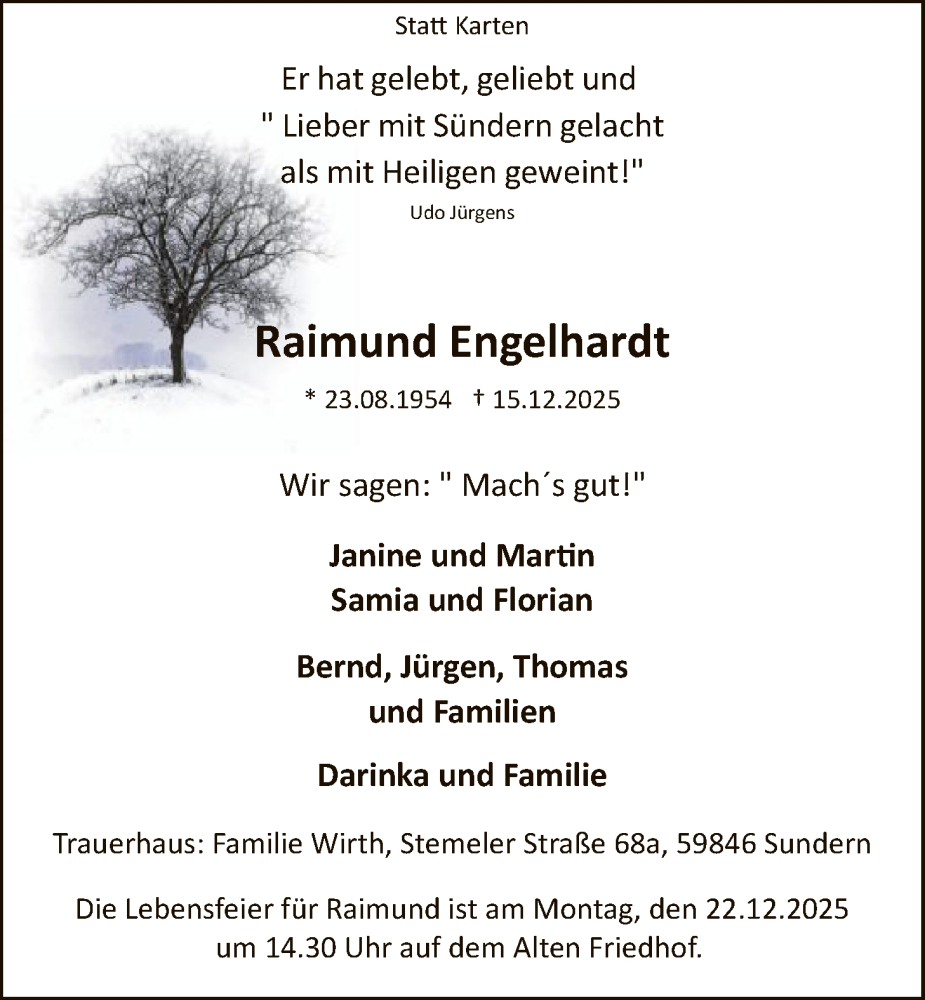 Hier finden Sie alle Traueranzeigen aus der Zeitung, die bisher für Raimund Engelhardt erschienen sind. Weitere Traueranzeigen, die in der Zeitung erscheinen, werden hier ebenfalls aufgelistet