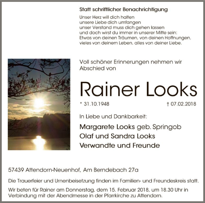 Hier finden Sie alle Traueranzeigen aus der Zeitung, die bisher für Rainer Looks erschienen sind. Weitere Traueranzeigen, die in der Zeitung erscheinen, werden hier ebenfalls aufgelistet