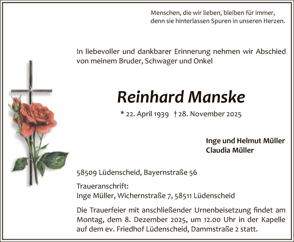 Hier finden Sie alle Traueranzeigen aus der Zeitung, die bisher für Reinhard Manske erschienen sind. Weitere Traueranzeigen, die in der Zeitung erscheinen, werden hier ebenfalls aufgelistet