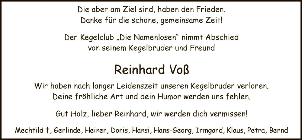 Hier finden Sie alle Traueranzeigen aus der Zeitung, die bisher für Reinhard Voß erschienen sind. Weitere Traueranzeigen, die in der Zeitung erscheinen, werden hier ebenfalls aufgelistet