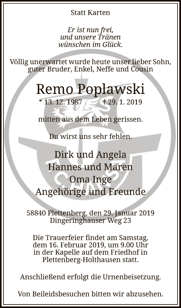 Hier finden Sie alle Traueranzeigen aus der Zeitung, die bisher für Remo Poplawski erschienen sind. Weitere Traueranzeigen, die in der Zeitung erscheinen, werden hier ebenfalls aufgelistet