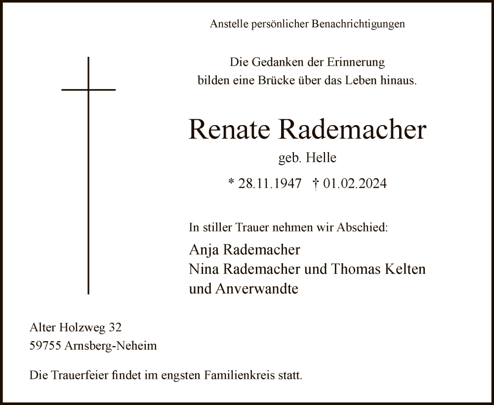 Hier finden Sie alle Traueranzeigen aus der Zeitung, die bisher für Renate Rademacher erschienen sind. Weitere Traueranzeigen, die in der Zeitung erscheinen, werden hier ebenfalls aufgelistet