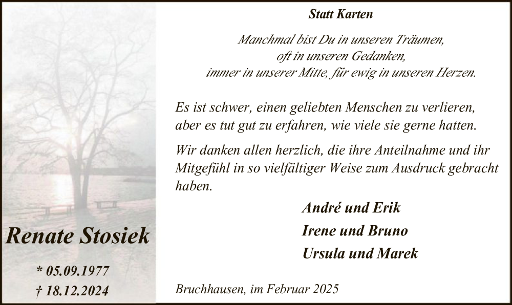 Hier finden Sie alle Traueranzeigen aus der Zeitung, die bisher für Renate Stosiek erschienen sind. Weitere Traueranzeigen, die in der Zeitung erscheinen, werden hier ebenfalls aufgelistet