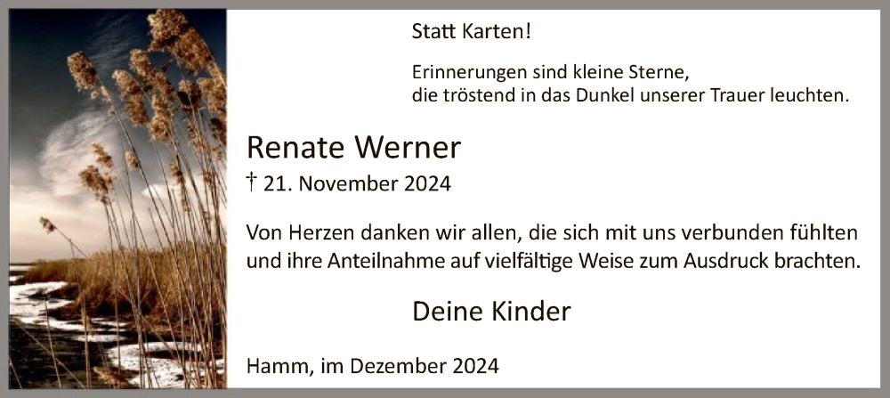 Hier finden Sie alle Traueranzeigen aus der Zeitung, die bisher für Renate Werner erschienen sind. Weitere Traueranzeigen, die in der Zeitung erscheinen, werden hier ebenfalls aufgelistet