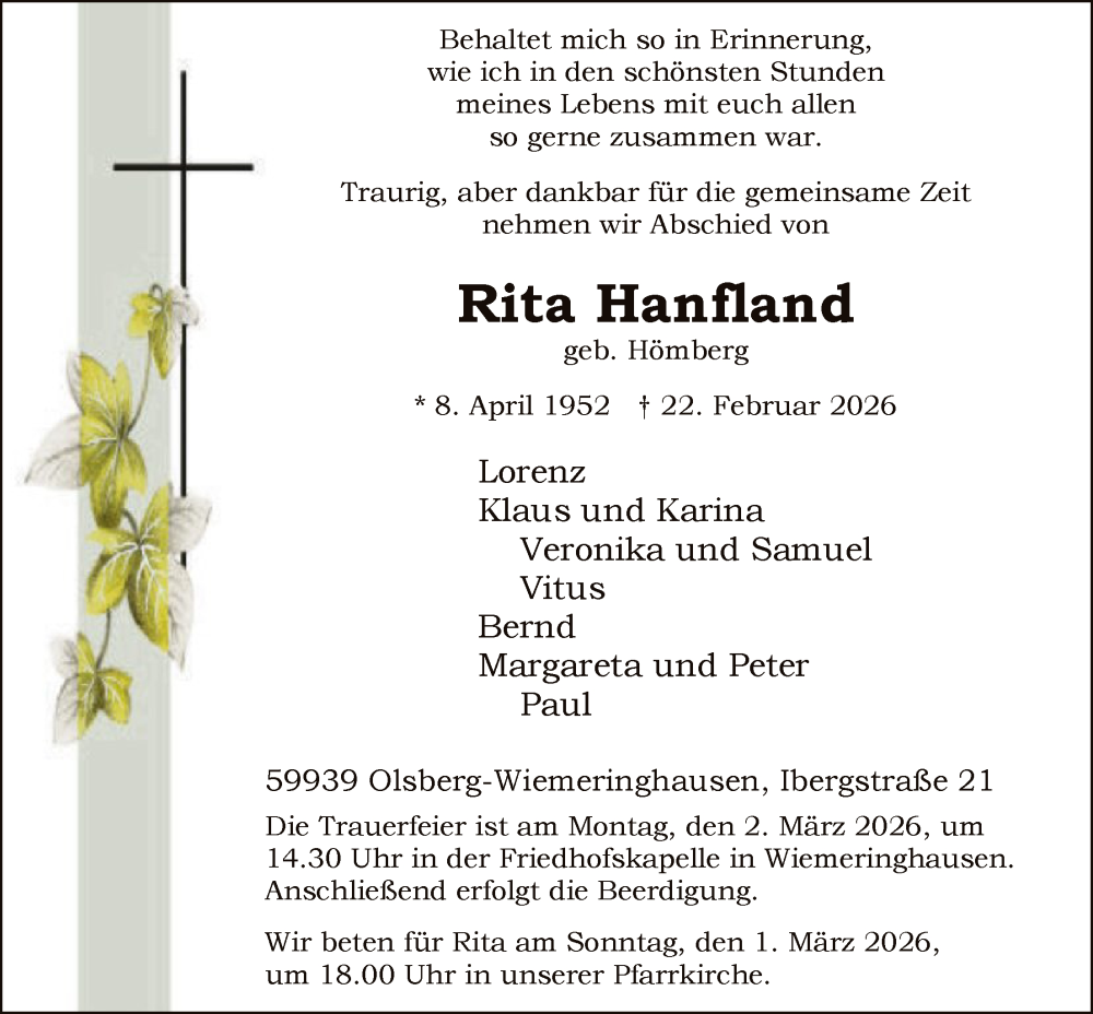Hier finden Sie alle Traueranzeigen aus der Zeitung, die bisher für Rita Hanfland erschienen sind. Weitere Traueranzeigen, die in der Zeitung erscheinen, werden hier ebenfalls aufgelistet