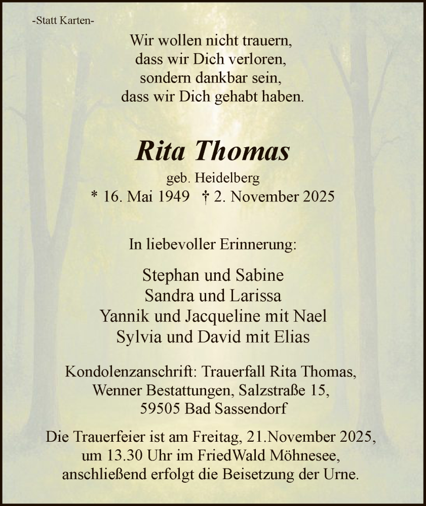 Hier finden Sie alle Traueranzeigen aus der Zeitung, die bisher für Rita Thomas erschienen sind. Weitere Traueranzeigen, die in der Zeitung erscheinen, werden hier ebenfalls aufgelistet