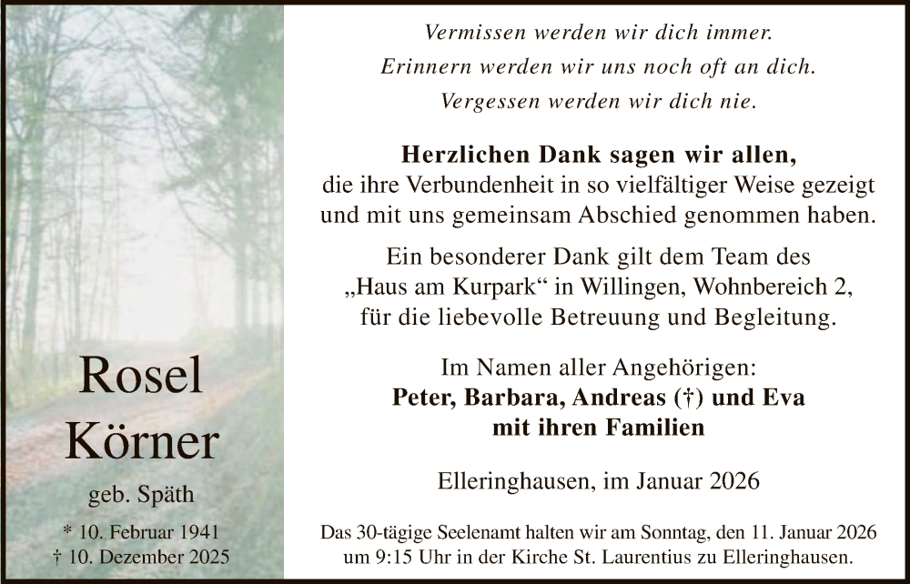 Hier finden Sie alle Traueranzeigen aus der Zeitung, die bisher für Rosel Körner erschienen sind. Weitere Traueranzeigen, die in der Zeitung erscheinen, werden hier ebenfalls aufgelistet