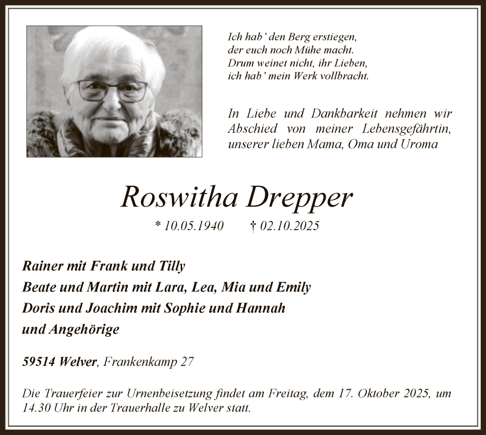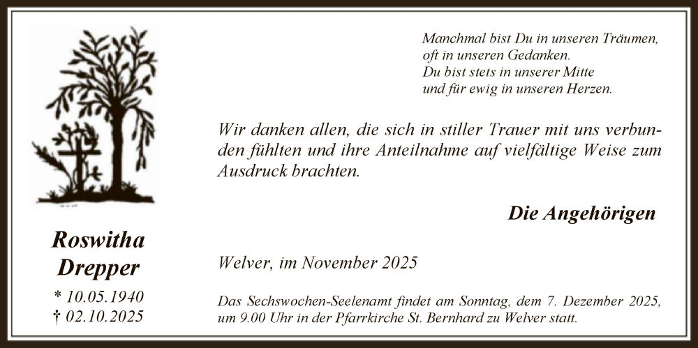 Hier finden Sie alle Traueranzeigen aus der Zeitung, die bisher für Roswitha Drepper erschienen sind. Weitere Traueranzeigen, die in der Zeitung erscheinen, werden hier ebenfalls aufgelistet