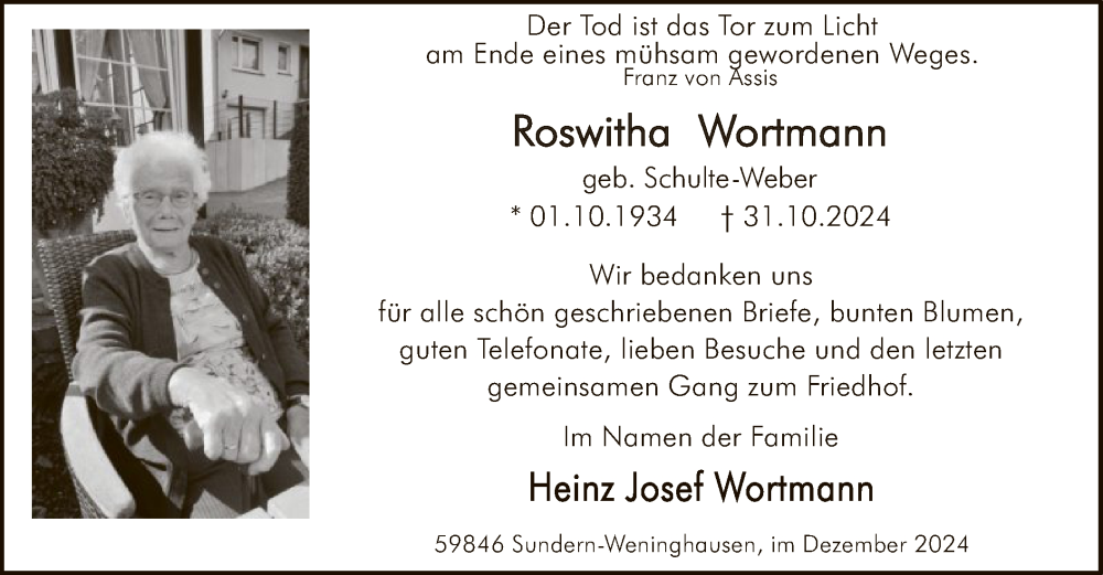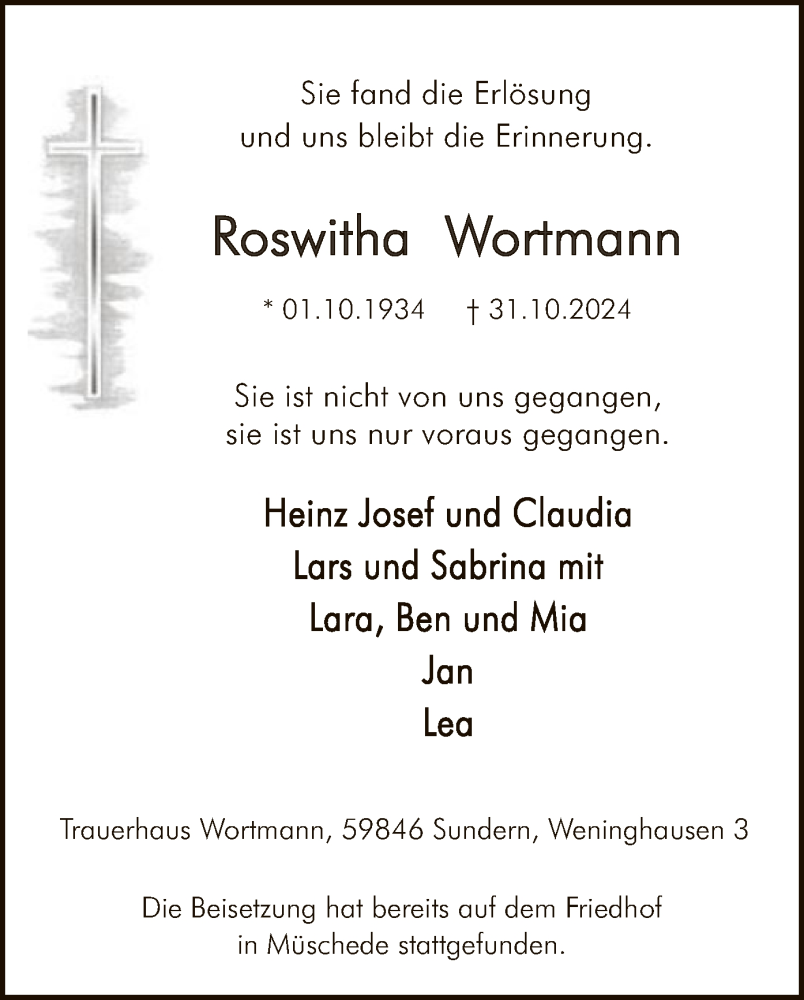 Hier finden Sie alle Traueranzeigen aus der Zeitung, die bisher für Roswitha Wortmann erschienen sind. Weitere Traueranzeigen, die in der Zeitung erscheinen, werden hier ebenfalls aufgelistet