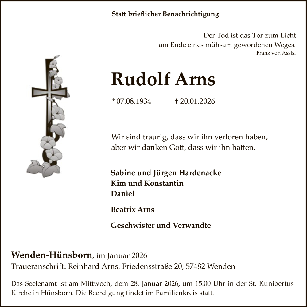 Hier finden Sie alle Traueranzeigen aus der Zeitung, die bisher für Rudolf Arns erschienen sind. Weitere Traueranzeigen, die in der Zeitung erscheinen, werden hier ebenfalls aufgelistet