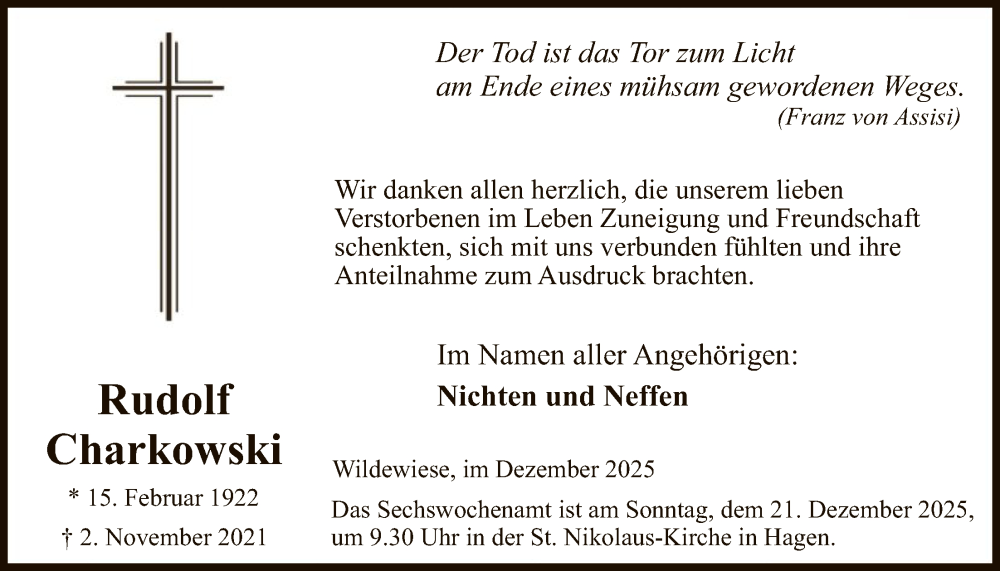 Hier finden Sie alle Traueranzeigen aus der Zeitung, die bisher für Rudolf Charkowski erschienen sind. Weitere Traueranzeigen, die in der Zeitung erscheinen, werden hier ebenfalls aufgelistet