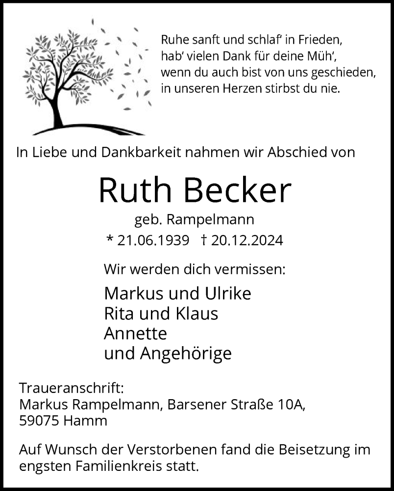 Hier finden Sie alle Traueranzeigen aus der Zeitung, die bisher für Ruth Becker erschienen sind. Weitere Traueranzeigen, die in der Zeitung erscheinen, werden hier ebenfalls aufgelistet
