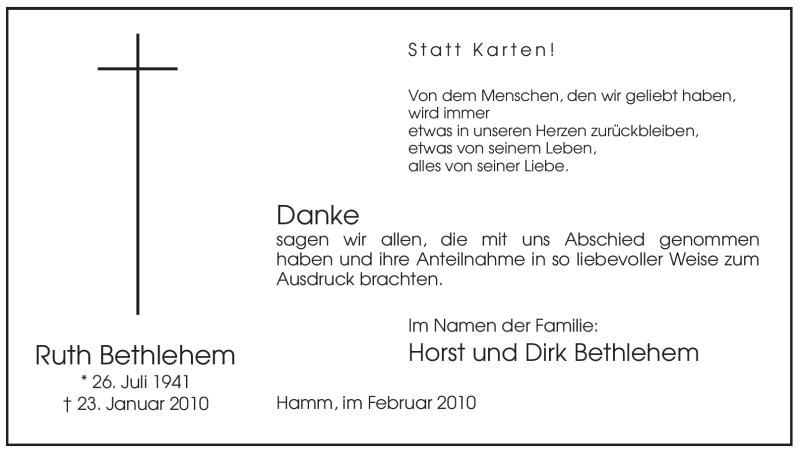 Hier finden Sie alle Traueranzeigen aus der Zeitung, die bisher für Ruth Bethlehem erschienen sind. Weitere Traueranzeigen, die in der Zeitung erscheinen, werden hier ebenfalls aufgelistet