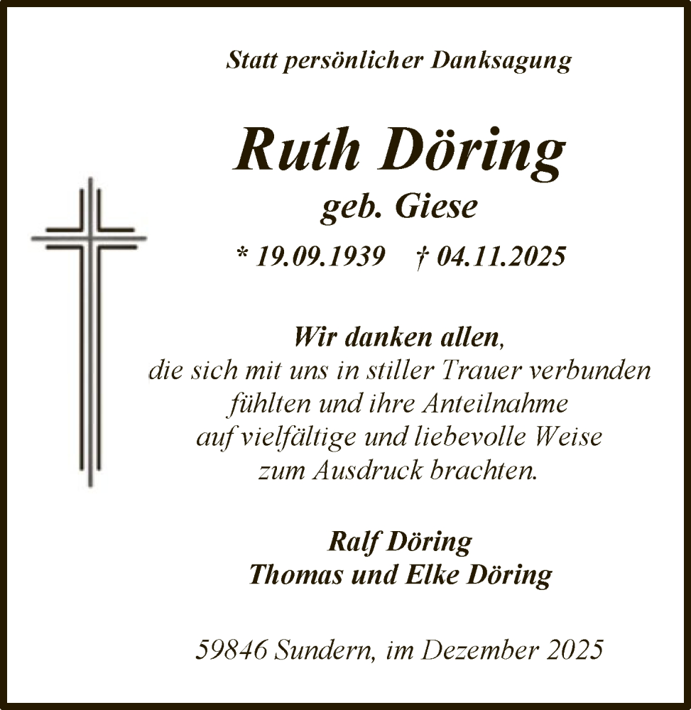 Hier finden Sie alle Traueranzeigen aus der Zeitung, die bisher für Ruth Döring erschienen sind. Weitere Traueranzeigen, die in der Zeitung erscheinen, werden hier ebenfalls aufgelistet