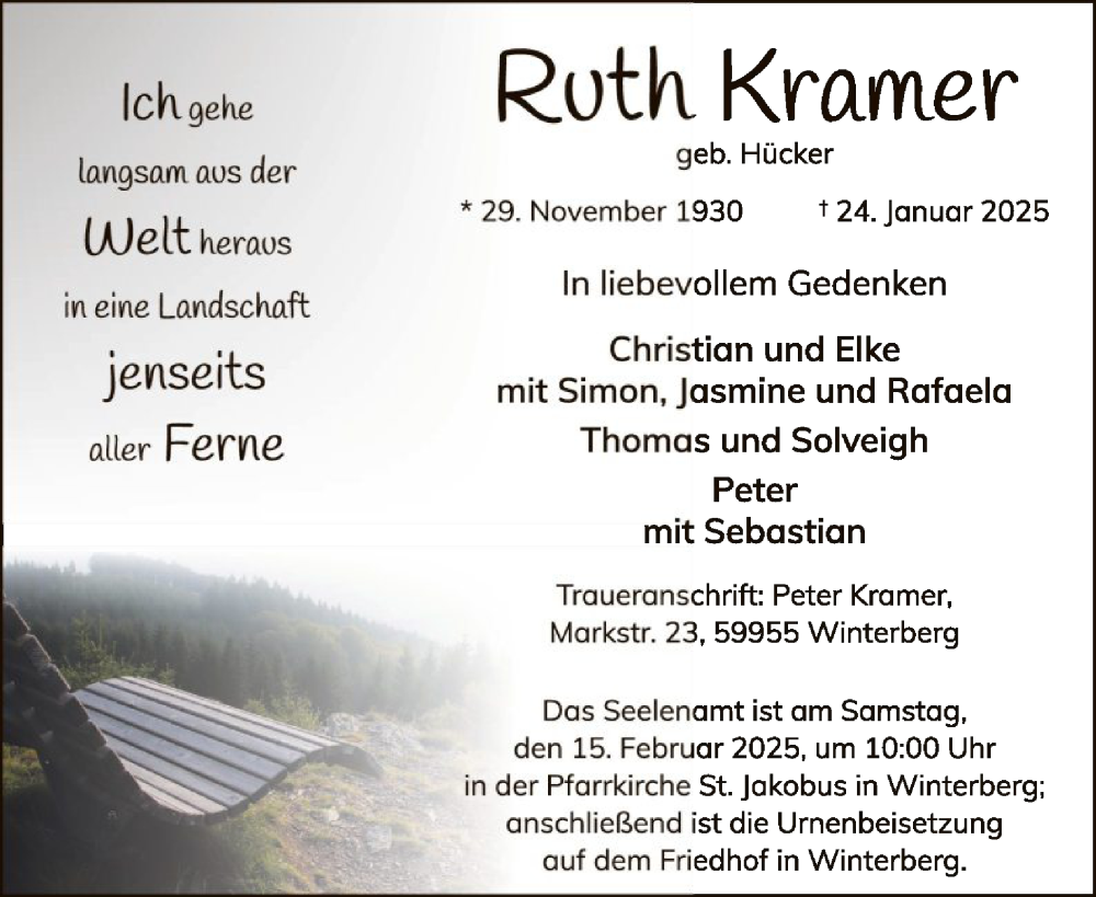 Hier finden Sie alle Traueranzeigen aus der Zeitung, die bisher für Ruth Kramer erschienen sind. Weitere Traueranzeigen, die in der Zeitung erscheinen, werden hier ebenfalls aufgelistet