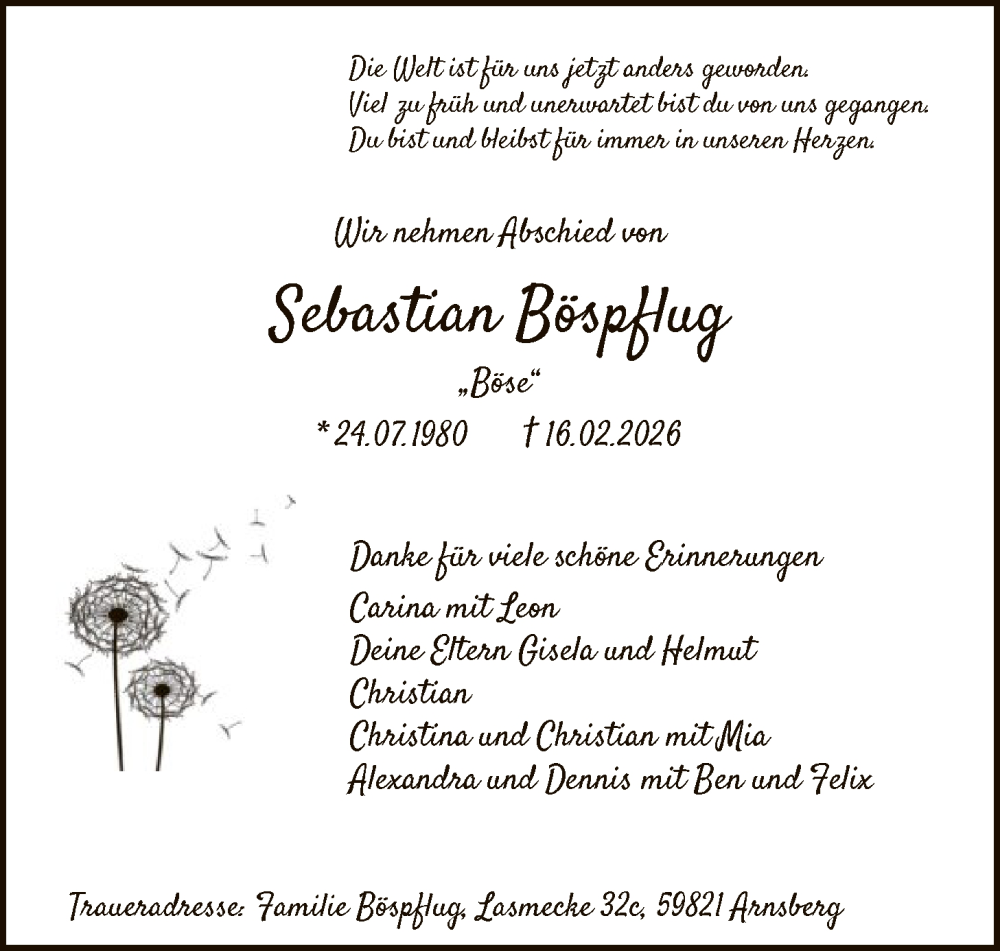 Hier finden Sie alle Traueranzeigen aus der Zeitung, die bisher für Sebastian Böspflug erschienen sind. Weitere Traueranzeigen, die in der Zeitung erscheinen, werden hier ebenfalls aufgelistet