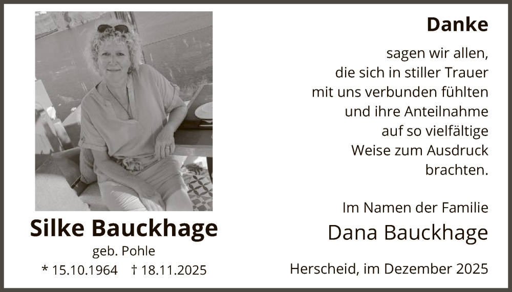 Hier finden Sie alle Traueranzeigen aus der Zeitung, die bisher für Silke Bauckhage erschienen sind. Weitere Traueranzeigen, die in der Zeitung erscheinen, werden hier ebenfalls aufgelistet
