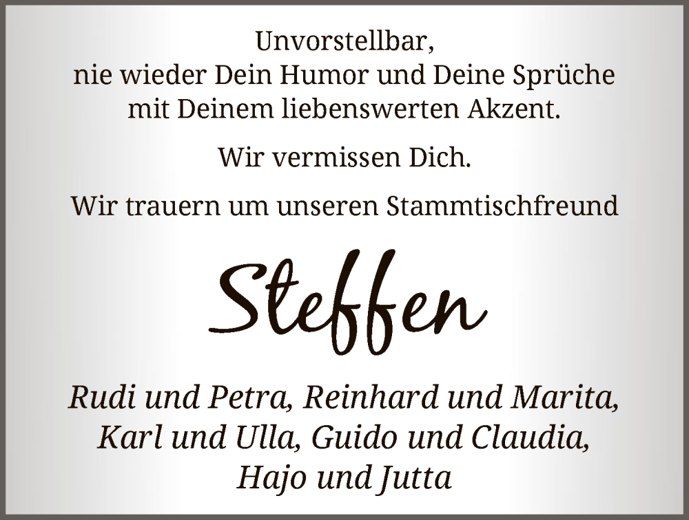 Hier finden Sie alle Traueranzeigen aus der Zeitung, die bisher für Steffen erschienen sind. Weitere Traueranzeigen, die in der Zeitung erscheinen, werden hier ebenfalls aufgelistet