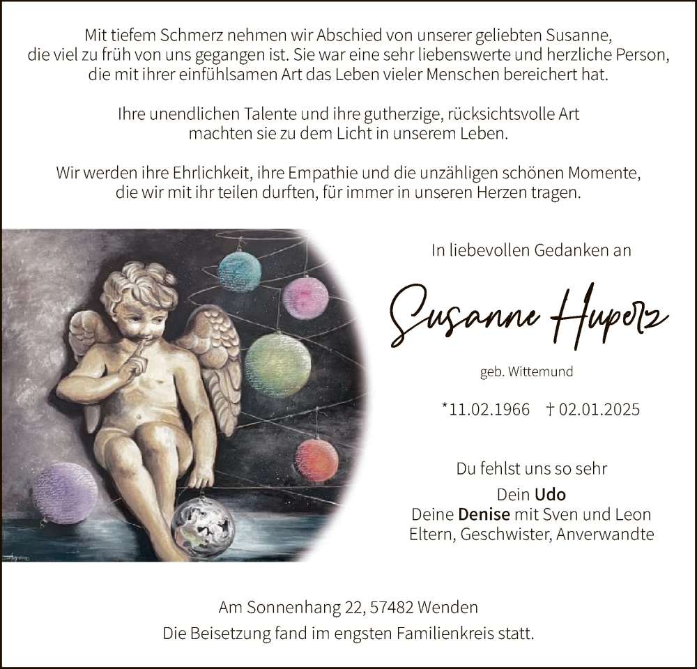 Hier finden Sie alle Traueranzeigen aus der Zeitung, die bisher für Susanne Huperz erschienen sind. Weitere Traueranzeigen, die in der Zeitung erscheinen, werden hier ebenfalls aufgelistet
