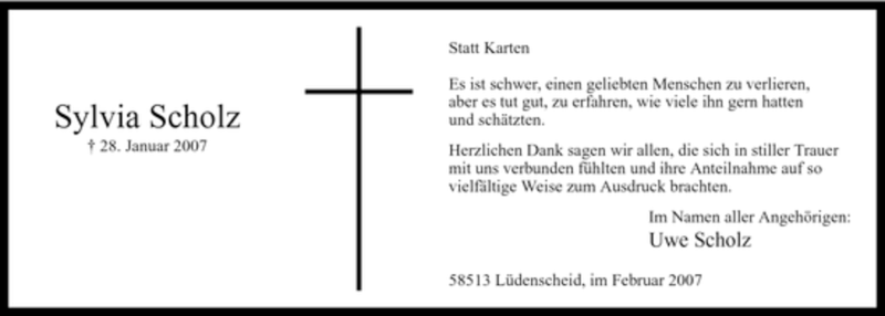 Hier finden Sie alle Traueranzeigen aus der Zeitung, die bisher für Sylvia Scholz erschienen sind. Weitere Traueranzeigen, die in der Zeitung erscheinen, werden hier ebenfalls aufgelistet