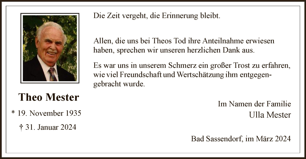 Hier finden Sie alle Traueranzeigen aus der Zeitung, die bisher für Theo Mester erschienen sind. Weitere Traueranzeigen, die in der Zeitung erscheinen, werden hier ebenfalls aufgelistet
