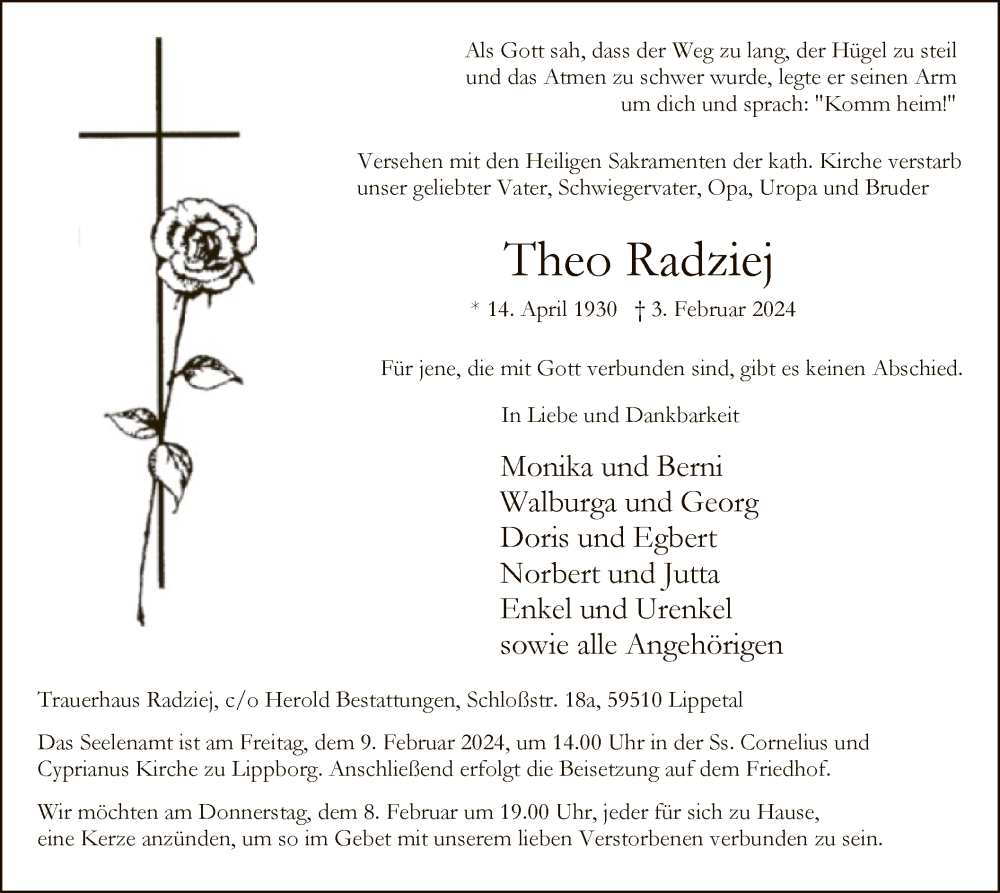 Hier finden Sie alle Traueranzeigen aus der Zeitung, die bisher für Theo Radziej erschienen sind. Weitere Traueranzeigen, die in der Zeitung erscheinen, werden hier ebenfalls aufgelistet