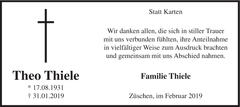 Hier finden Sie alle Traueranzeigen aus der Zeitung, die bisher für Theo Thiele erschienen sind. Weitere Traueranzeigen, die in der Zeitung erscheinen, werden hier ebenfalls aufgelistet