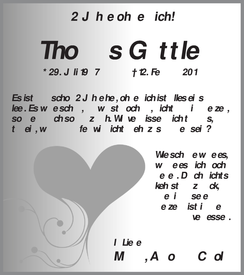 Hier finden Sie alle Traueranzeigen aus der Zeitung, die bisher für Thomas Güttler erschienen sind. Weitere Traueranzeigen, die in der Zeitung erscheinen, werden hier ebenfalls aufgelistet