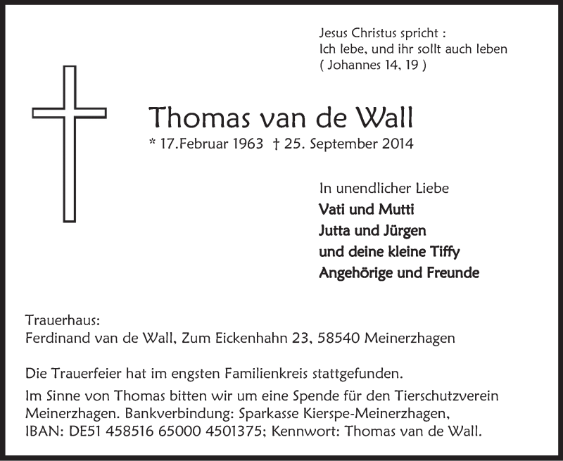 Hier finden Sie alle Traueranzeigen aus der Zeitung, die bisher für Thomas van de Wall erschienen sind. Weitere Traueranzeigen, die in der Zeitung erscheinen, werden hier ebenfalls aufgelistet