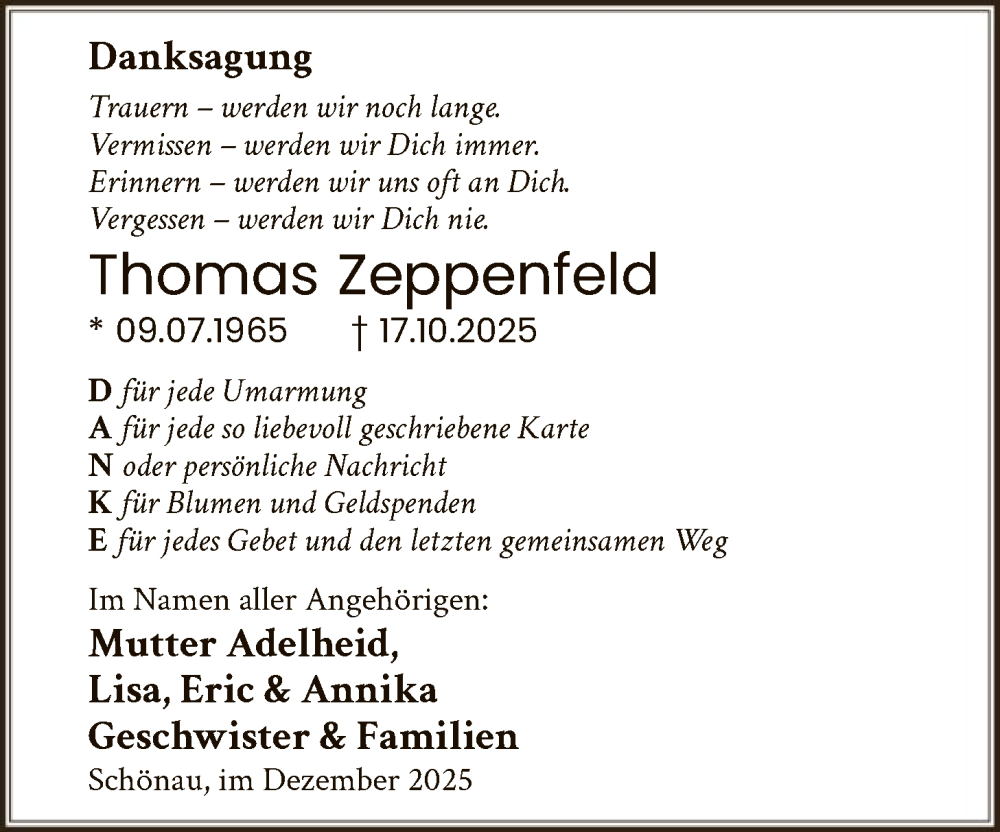 Hier finden Sie alle Traueranzeigen aus der Zeitung, die bisher für Thomas Zeppenfeld erschienen sind. Weitere Traueranzeigen, die in der Zeitung erscheinen, werden hier ebenfalls aufgelistet