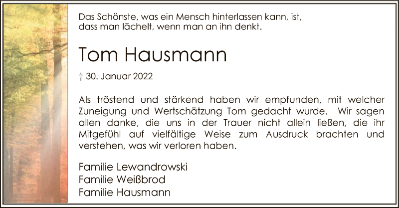 Hier finden Sie alle Traueranzeigen aus der Zeitung, die bisher für Tom Hausmann erschienen sind. Weitere Traueranzeigen, die in der Zeitung erscheinen, werden hier ebenfalls aufgelistet
