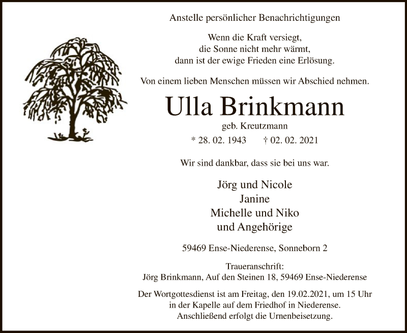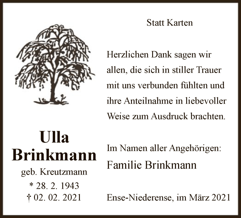Hier finden Sie alle Traueranzeigen aus der Zeitung, die bisher für Ulla Brinkmann erschienen sind. Weitere Traueranzeigen, die in der Zeitung erscheinen, werden hier ebenfalls aufgelistet