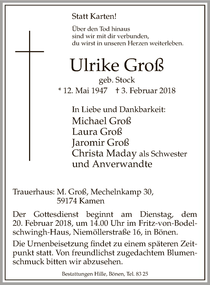 Hier finden Sie alle Traueranzeigen aus der Zeitung, die bisher für Ulrike Groß erschienen sind. Weitere Traueranzeigen, die in der Zeitung erscheinen, werden hier ebenfalls aufgelistet