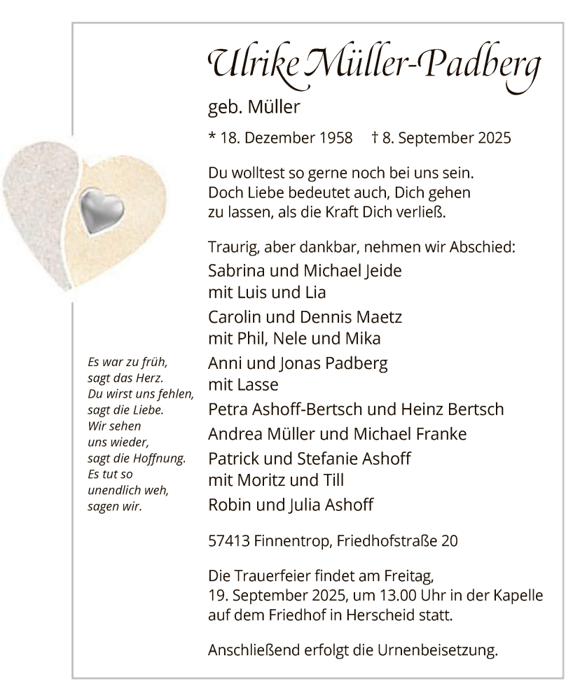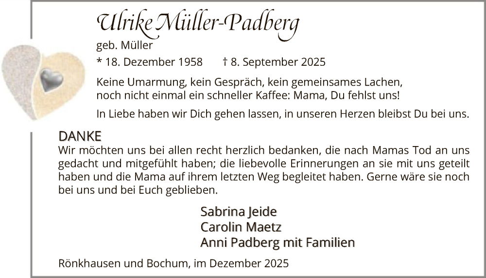 Hier finden Sie alle Traueranzeigen aus der Zeitung, die bisher für Ulrike Müller-Padberg erschienen sind. Weitere Traueranzeigen, die in der Zeitung erscheinen, werden hier ebenfalls aufgelistet