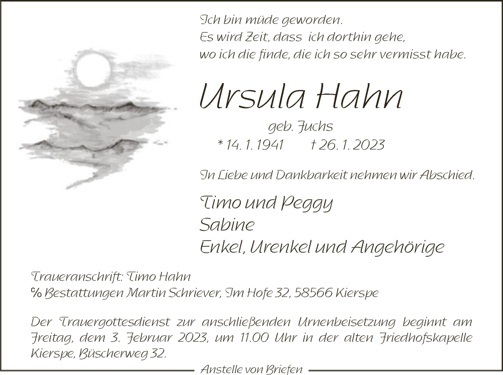 Hier finden Sie alle Traueranzeigen aus der Zeitung, die bisher für Ursula Hahn erschienen sind. Weitere Traueranzeigen, die in der Zeitung erscheinen, werden hier ebenfalls aufgelistet