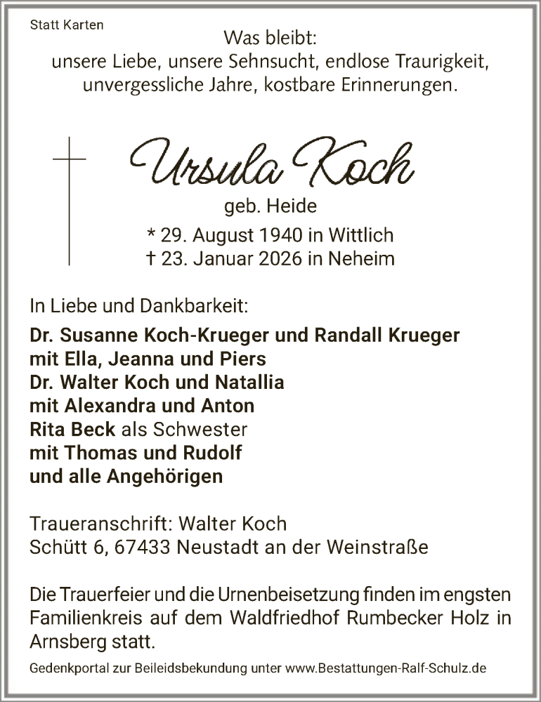 Hier finden Sie alle Traueranzeigen aus der Zeitung, die bisher für Ursula Koch erschienen sind. Weitere Traueranzeigen, die in der Zeitung erscheinen, werden hier ebenfalls aufgelistet