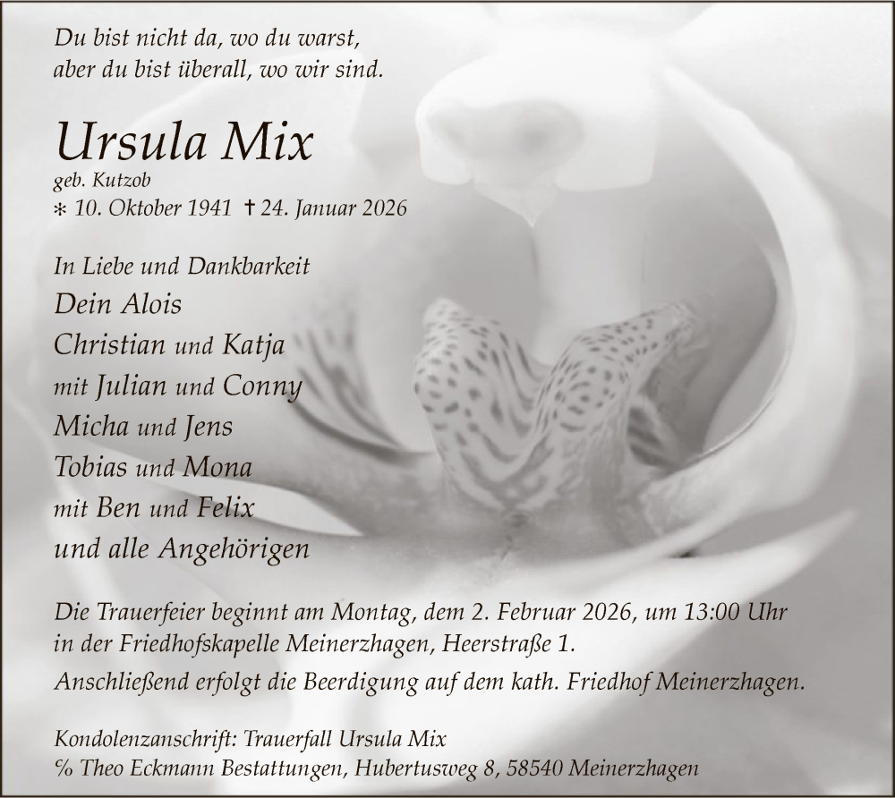 Hier finden Sie alle Traueranzeigen aus der Zeitung, die bisher für Ursula Mix erschienen sind. Weitere Traueranzeigen, die in der Zeitung erscheinen, werden hier ebenfalls aufgelistet
