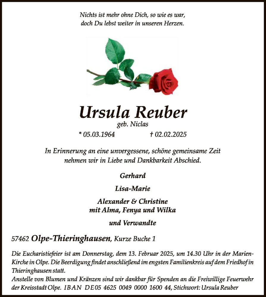 Hier finden Sie alle Traueranzeigen aus der Zeitung, die bisher für Ursula Reuber erschienen sind. Weitere Traueranzeigen, die in der Zeitung erscheinen, werden hier ebenfalls aufgelistet