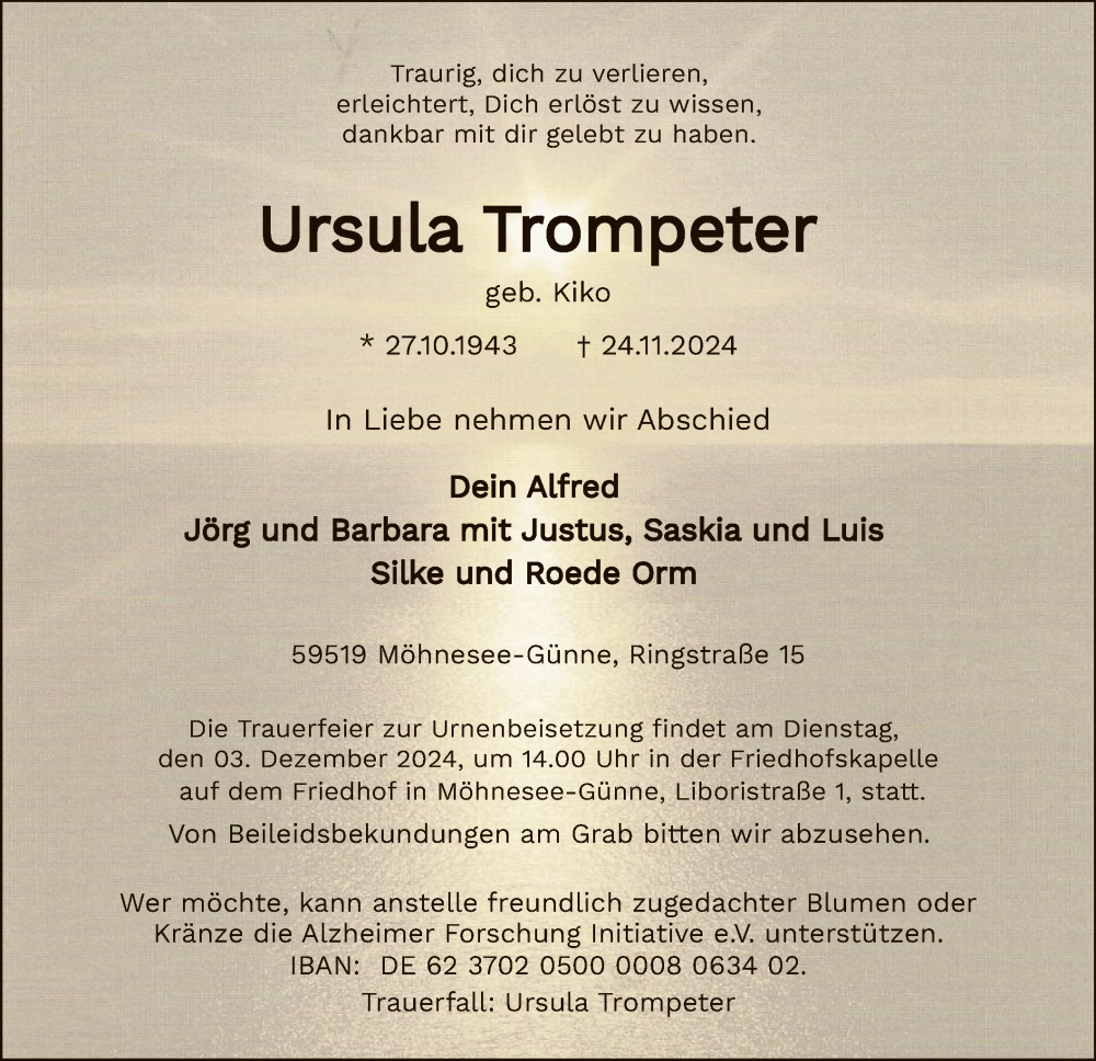 Hier finden Sie alle Traueranzeigen aus der Zeitung, die bisher für Ursula Trompeter erschienen sind. Weitere Traueranzeigen, die in der Zeitung erscheinen, werden hier ebenfalls aufgelistet
