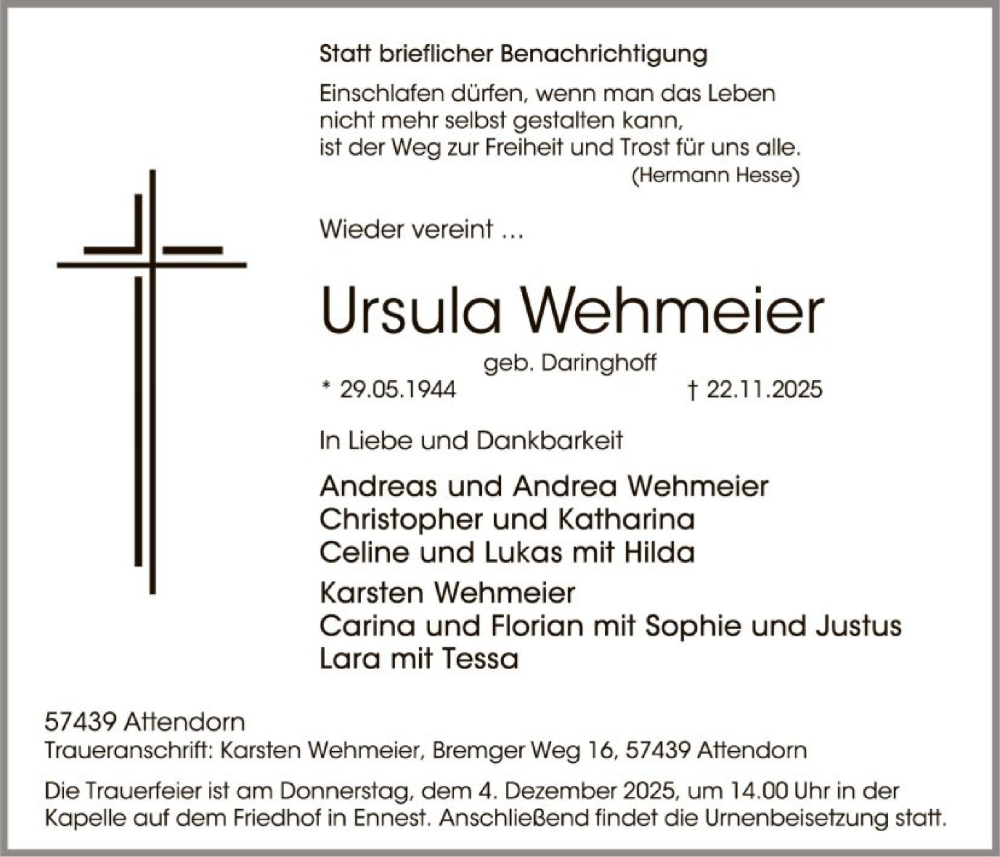 Hier finden Sie alle Traueranzeigen aus der Zeitung, die bisher für Ursula Wehmeier erschienen sind. Weitere Traueranzeigen, die in der Zeitung erscheinen, werden hier ebenfalls aufgelistet